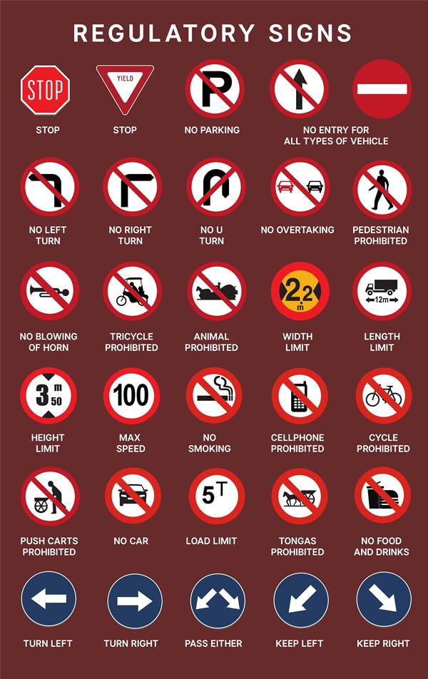 Regulatory signs are a collection of symbols used to display or enforce traffic laws, regulations, or requirements that apply at all times or at specific times or locations on a street or highway.